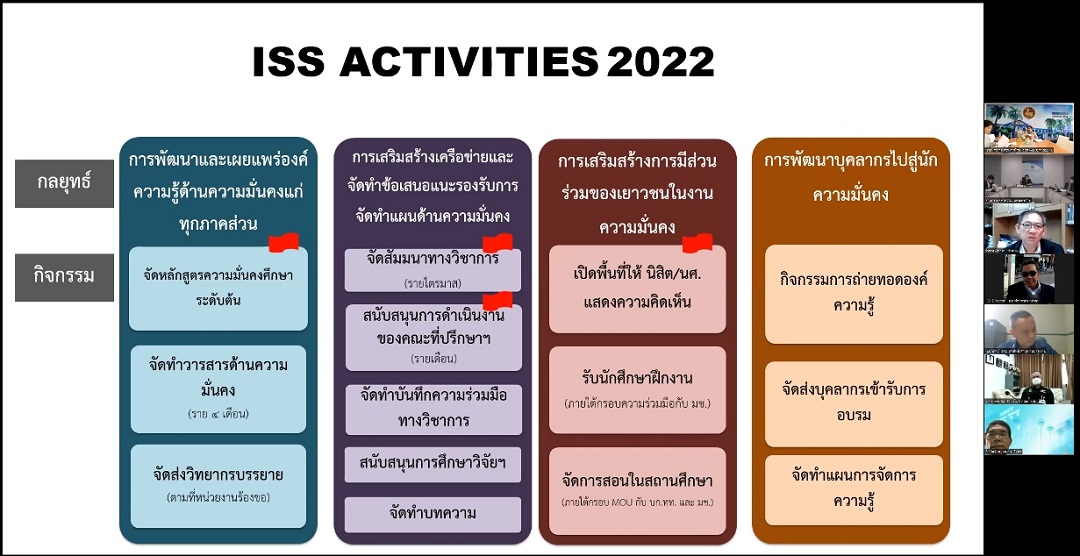 เมื่อวันพฤหัสบดีที่ 22 กันยายน 2565 สถาบันความมั่นคงศึกษา สำนักงานสภาความมั่นคงแห่งชาติ ได้จัดการประชุมคณะกรรมการนโยบายวิชาการด้านความมั่นคง ครั้งที่ 1/2565 ณ ห้องประชุมเล็ก แนวมาลี สำนักงานสภาความมั่นคงแห่งชาติ ศูนย์ราชการเฉลิมพระเกียรติฯ และการประชุมทางไกลผ่านสื่ออิเล็กทรอนิกส์ (Zoom Cloud Meeting) โดย เลขาธิการสภาความมั่นคงแห่งชาติ ได้มอบหมาย นายรัชกรณ์ นภาพรพิพัฒน์ รองเลขาธิการสภาความมั่นคงแห่งชาติ เป็นประธาน เพื่อรับทราบผลการประชุมคณะอนุกรรมการพิจารณากลั่นกรองเรื่องเสนอคณะกรรมการนโยบายวิชาการด้านความมั่นคง ครั้งที่ 2/2565 ข้อสั่งการในที่ประชุมคณะกรรมการนโยบายของสภาความมั่นคงแห่งชาติ เกี่ยวกับผลการดำเนินงานของสถาบันความมั่นคงศึกษา และแนวคิดเชิงออกแบบกับการบริหารงานภาครัฐ อีกทั้งให้ความเห็นและข้อเสนอแนะต่อ แผนการดำเนินงานวิชาการด้านความมั่นคงของสถาบันความมั่นคงศึกษา ประจำปีงบประมาณ พ.ศ. 2566 และแผนการเสริมสร้างการมีส่วนร่วมของนิสิตนักศึกษาในงานวิชาการด้านความมั่นคงและการส่งเสริมการพัฒนาศักยภาพ เพื่อสนับสนุนการขับเคลื่อนงานภาครัฐ