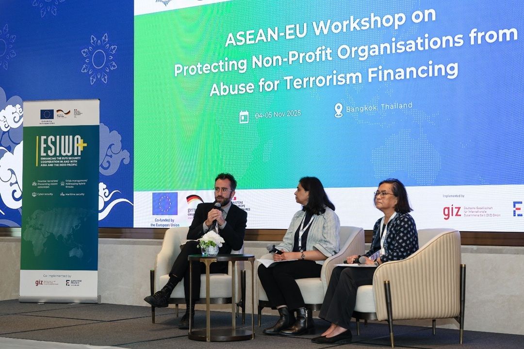 เมื่อวันที่ ๔ – ๕ พฤศจิกายน ๒๕๖๘ สำนักงานสภาความมั่นคงแห่งชาติ (สมช.) ร่วมกับ สำนักงานป้องกันและปราบปรามการฟอกเงิน (สำนักงาน ปปง.) และ สหภาพยุโรปภายใต้โครงการ ESIWA+ (Enhancing the EU’s Security Cooperation In and With Asia and the Indo-Pacific) จัดการประชุมเชิงปฏิบัติการ หัวข้อ “ASEAN-EU Workshop on Protecting Non-Profit Organisations from Abuse for Terrorism Financing” ณ โรงแรมแกรนด์ เซ็นเตอร์ พอยท์ สุรวงศ์ กรุงเทพฯ โดยมี นายไผท สิทธิสุนทร ผู้ช่วยเลขาธิการสภาความมั่นคงแห่งชาติ กล่าวเปิดงานร่วมกับผู้แทนระดับสูงจากคณะผู้แทนสหภาพยุโรปประจำประเทศไทย สำนักงานต่อต้านการก่อการร้ายแห่งชาติอินโดนีเซีย (BNPT) และโครงการความร่วมมือระดับโลกของสหภาพยุโรปด้านการป้องกันและปราบปรามการฟอกเงินและการจัดหาเงินทุนให้การก่อการร้าย (AML/CTF). ทั้งนี้ มีผู้เข้าร่วมประชุมประมาณ ๖๐ คน จากประเทศไทย สหภาพยุโรป และประเทศสมาชิกอาเซียน