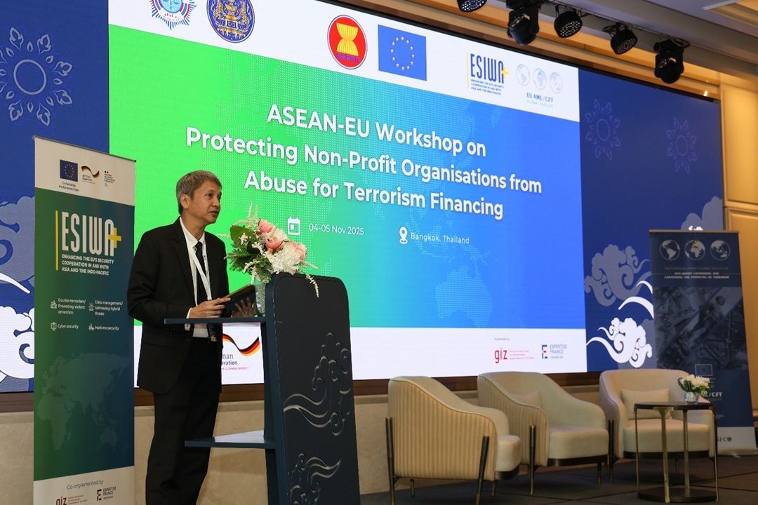 On November 4 – 5, 2025, the Office of the National Security Council (NSC), in collaboration with the Anti-Money Laundering Office (AMLO) of Thailand, and the European Union (EU) under the ESIWA+ Project (Enhancing the EU’s Security Cooperation In and With Asia and the Indo-Pacific), organized a workshop titled “ASEAN-EU Workshop on Protecting Non-Profit Organisations from Abuse for Terrorism Financing” at the Grande Centre Point Surawong Hotel. Mr. Patai Sidisunthorn, Assistant Secretary-General of the National Security Council, delivered the opening remarks, along with the high-level representatives from the EU Delegation to Thailand, the Indonesian National Counterterrorism Agency (BNPT), and the EU Global Facility on Anti-Money Laundering and Counter-Terrorism Financing (AML/CTF). Approximately 60 participants from Thailand, the EU, and ASEAN member states attended the workshop.