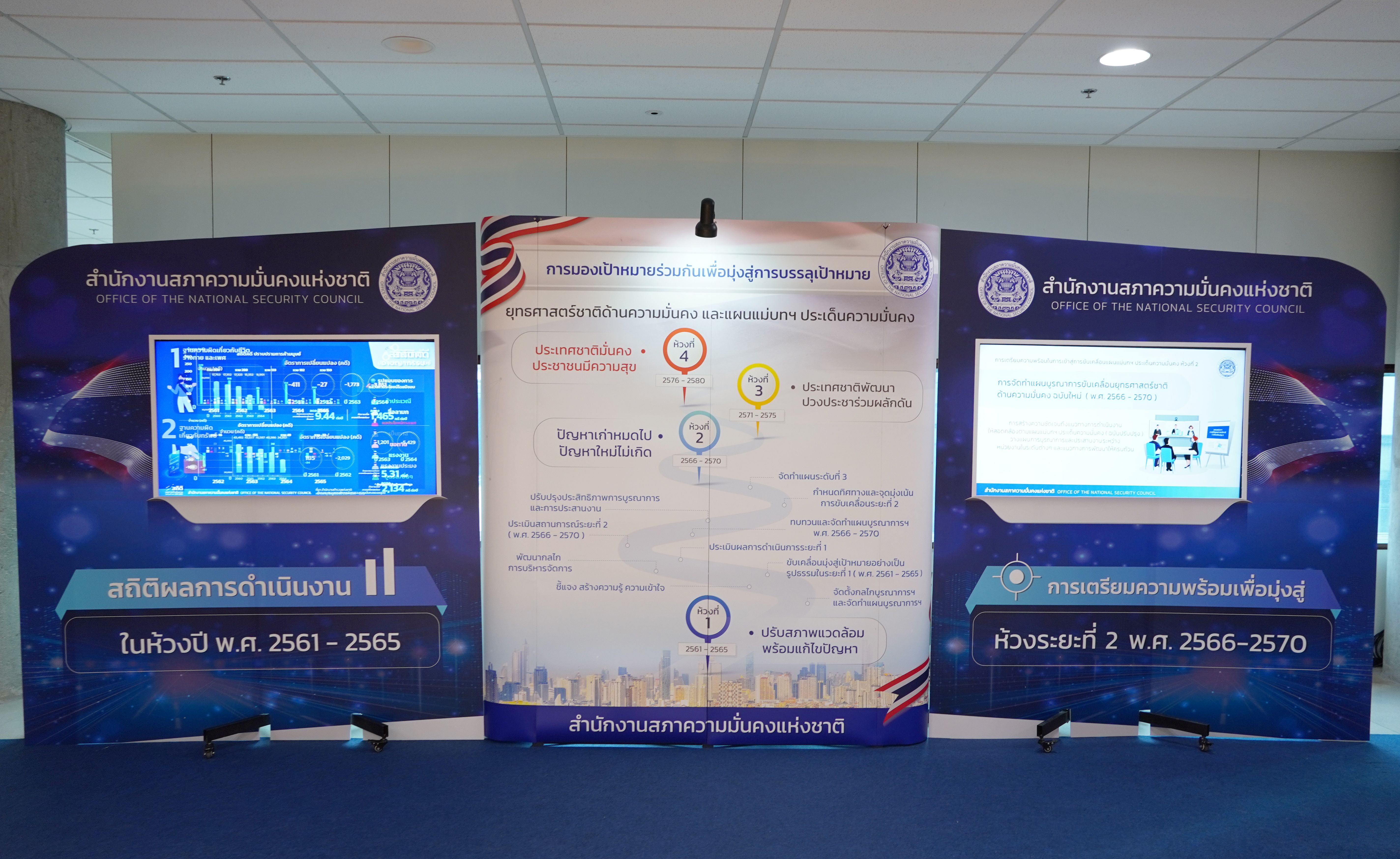 การแถลงผลสัมฤทธิ์ฯ ในส่วนของสำนักงานฯ มีรองเลขาธิการสภาความมั่นคงแห่งชาติ (นายรัชกรณ์ นภาพรพิพัฒน์) แถลงผลสัมฤทธิ์ฯ ในภาพรวม และชี้แจงทิศทางการขับเคลื่อนในห้วงระยะที่สอง (พ.ศ. ๒๕๖๖ – ๒๕๗๐) ที่ปรึกษาด้านนโยบายและยุทธศาสตร์ความมั่นคง (นายวรณัฐ คงเมือง) แถลงผลสัมฤทธิ์แผนย่อยการพัฒนากลไกการบริหารจัดการความมั่นคงแบบองค์รวม และ ผู้อำนวยการกองความมั่นคงกิจการชายแดนและประเทศรอบบ้าน (นางสาวอัญชลี ดวงแก้ว) แถลงผลสัมฤทธิ์การบริหารจัดการความมั่นคงทางชายแดน นอกจากนี้ผู้แทนส่วนราชการต่างๆ ได้แถลงผลสัมฤทธิ์ฯ ตามแผนย่อยของแผนแม่บทฯ ประเด็นความมั่นคงและประเด็นที่สำคัญ อาทิ แผนตำบลมั่นคง มั่งคั่ง ยั่งยืน แผนการป้องกันและแก้ไขปัญหาจังหวัดชายแดนภาคใต้ แผนการป้องกันและปราบปรามยาเสพติด แผนการป้องกันและแก้ไขปัญหาการค้ามนุษย์ และแผนการป้องกันและแก้ไขปัญหาความมั่นคงทางไซเบอร์