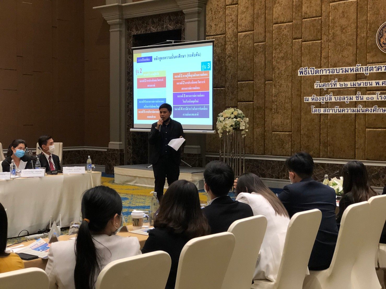 สถาบันความมั่นคงศึกษา สำนักงานสภาความมั่นคงแห่งชาติ (สมศ. สมช.) ได้จัดพิธีเปิดการฝึกอบรมหลักสูตรความมั่นคงศึกษา (ระดับต้น) รุ่นที่ ๓ เมื่อวันศุกร์ที่ ๒๒ เมษายน ๒๕๖๕ ณ โรงแรมเดอะ เบอร์เคลีย์ ประตูน้ำ โดยมีนายรัชกรณ์ นภาพรพิพัฒน์ รองเลขาธิการสภาความมั่นคงแห่งชาติ เป็นประธานในพิธีเปิดฯ มีวัตถุประสงค์ที่มุ่งเน้นการสร้างพื้นที่เพื่อเผยแพร่องค์ความรู้สู่การขับเคลื่อน (Knowledge for Driving) ซึ่งมีหัวข้อการศึกษาของหลักสูตรฯ ที่สอดคล้องกับหลักแนวคิดของยุทธศาสตร์ชาติ (พ.ศ. ๒๕๖๑ – ๒๕๘๐) แผนแม่บทภายใต้ยุทธศาสตร์ชาติประเด็นความมั่นคง นโยบายและแผนระดับชาติว่าด้วยความมั่นคงแห่งชาติ (พ.ศ. ๒๕๖๒ – ๒๕๖๕) รวมถึงบริบทของสถานการณ์ความมั่นคงที่สำคัญในปัจจุบันและแนวโน้ม โดยมีหมวดวิชา จำนวน ๔ หมวด ได้แก่