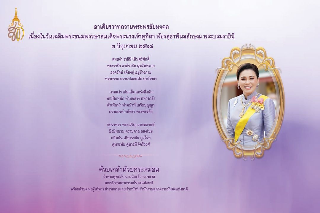 อาเศียรวาทถวายพระพรชัยมงคล เนื่องในวันเฉลิมพระชนมพรรษาสมเด็จพระนางเจ้าสุทิดา พัชรสุธาพิมลลักษณ พระบรมราชินี ๓ มิถุนายน ๒๕๖๘