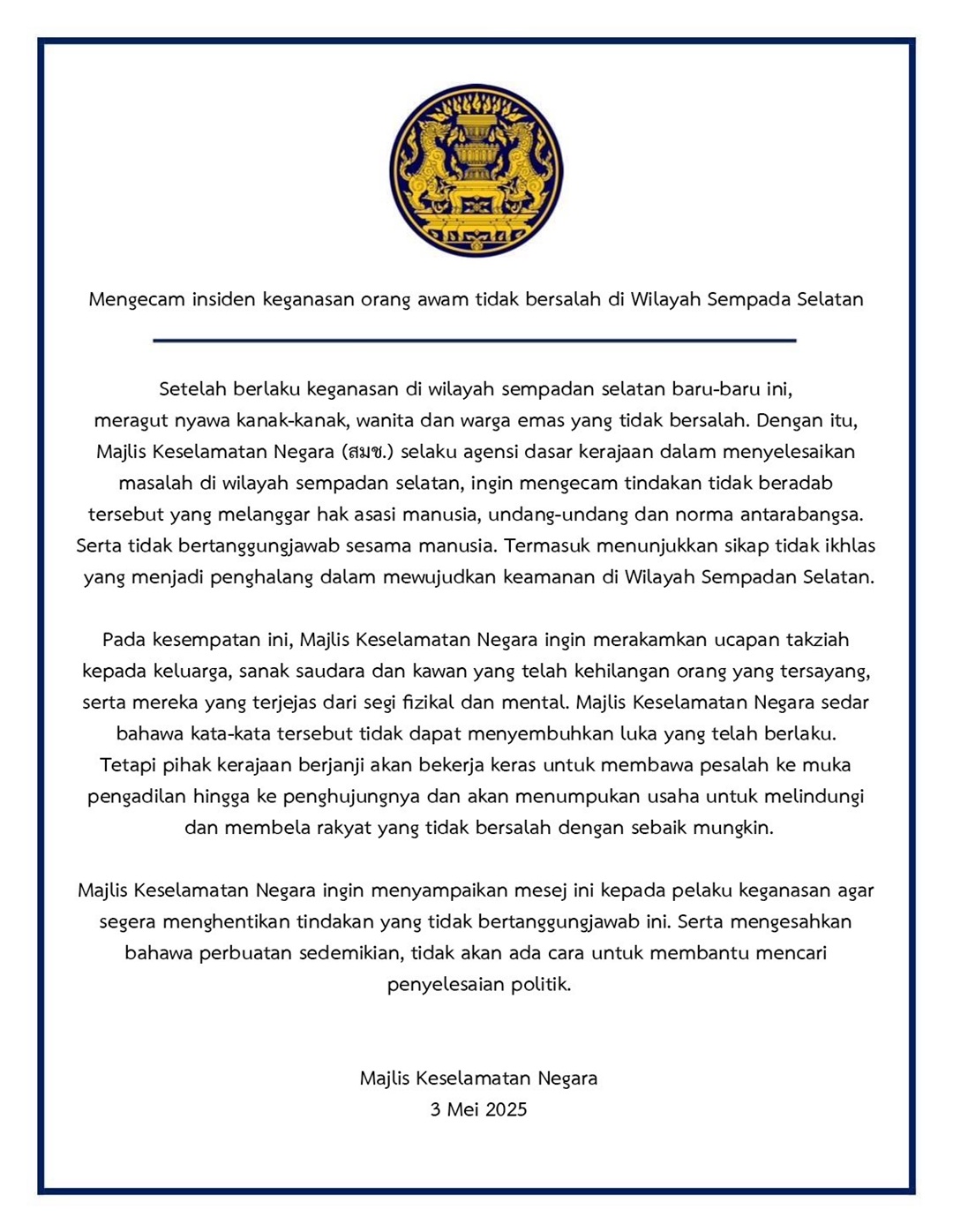 ตามที่ได้ปรากฎเหตุความรุนแรงในพื้นที่จังหวัดชายแดนภาคใต้ในห้วงที่ผ่านมา ซึ่งได้ก่อให้เกิดความสูญเสียต่อประชาชนผู้บริสุทธิ์ โดยเฉพาะเด็ก สตรี และผู้สูงอายุ นั้น สำนักงานสภาความมั่นคงแห่งชาติ (สมช.) ในฐานะหน่วยงานนโยบายในการแก้ไขปัญหาจังหวัดชายแดนภาคใต้ของรัฐบาล ขอประณามการกระทำที่ไร้อารยะดังกล่าว ซึ่งถือเป็นการละเมิดสิทธิมนุษยชน กฎหมาย และบรรทัดฐานระหว่างประเทศอย่างร้ายแรง และปราศจากซึ่งความรับผิดชอบต่อเพื่อนมนุษย์อย่างสิ้นเชิง ซึ่งล้วนแต่บั่นทอนบรรยากาศแห่งความไว้เนื้อเชื่อใจ รวมทั้งแสดงถึงความไม่จริงใจอันเป็นอุปสรรคต่อการสร้างสันติสุขในพื้นที่จังหวัดชายแดนภาคใต้