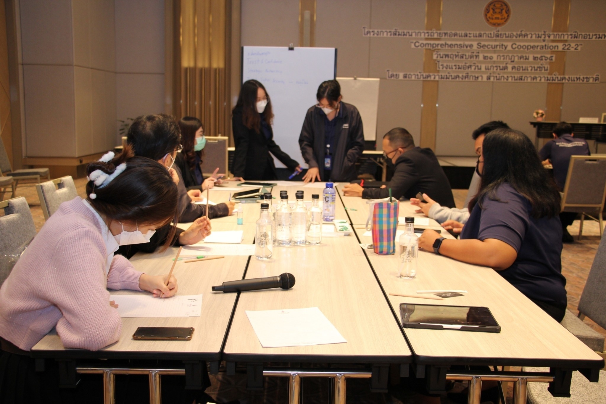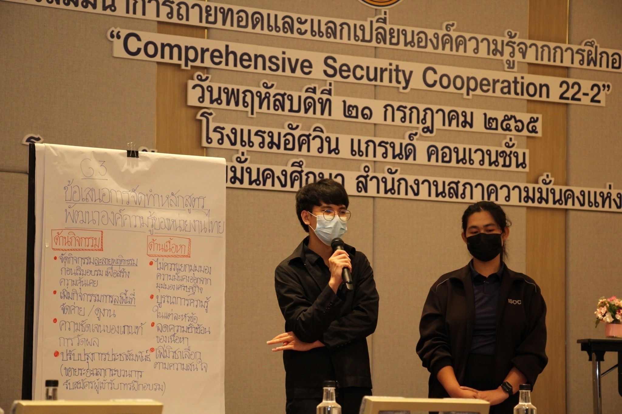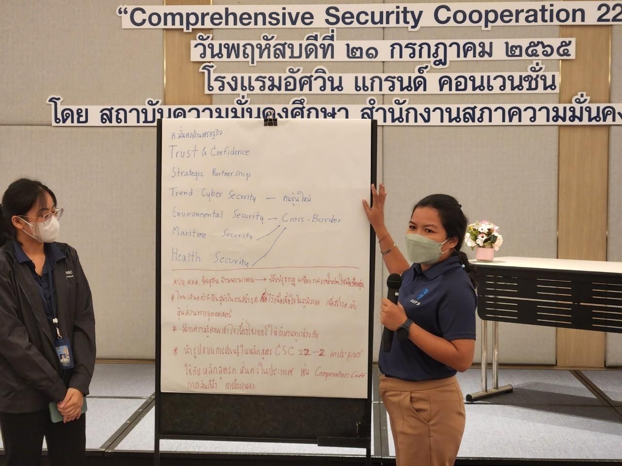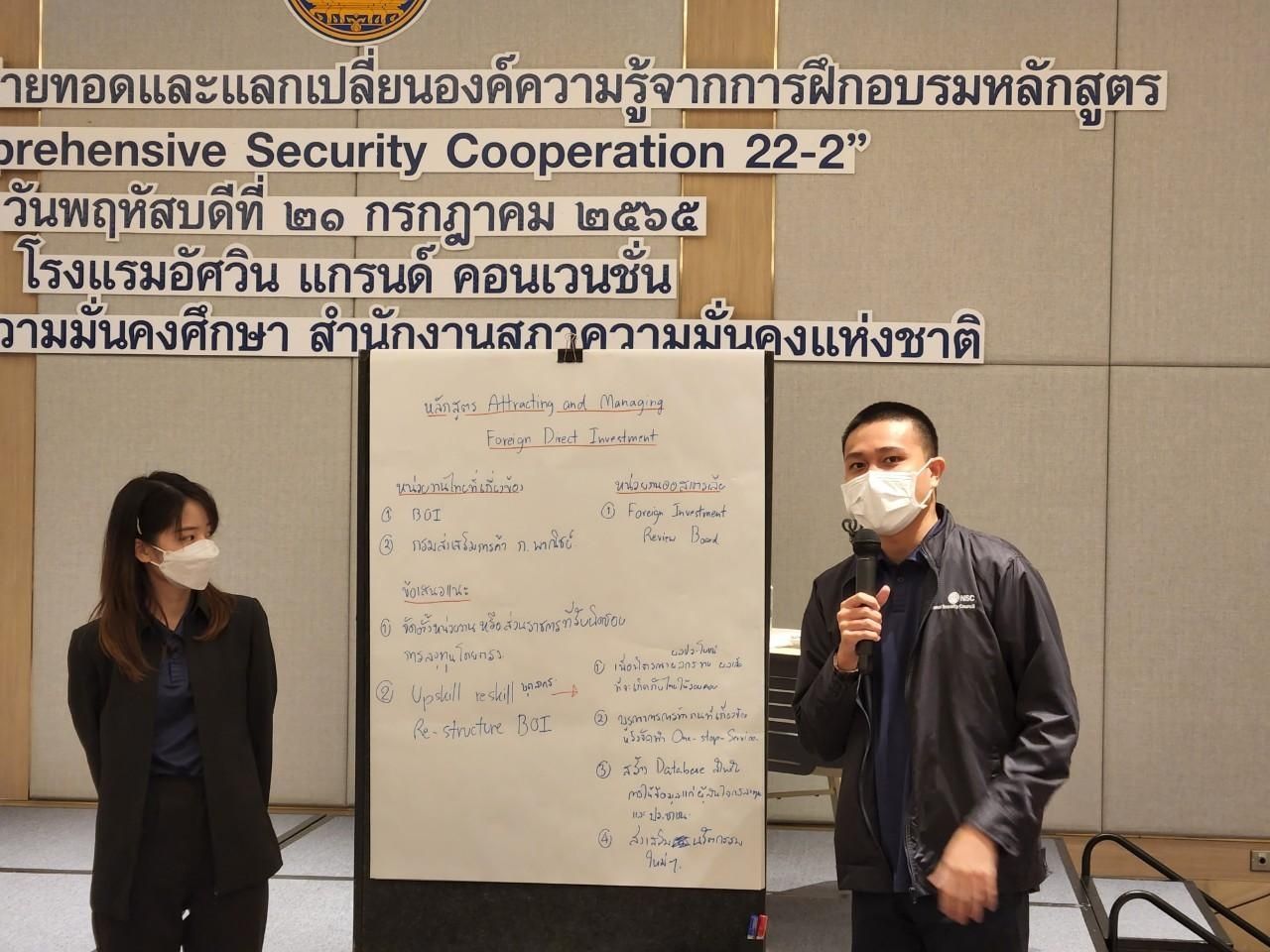 เมื่อวันที่ ๒๑ กรกฎาคม ๒๕๖๕ สถาบันความมั่นคงศึกษา (สมศ.) จัดโครงการสัมมนาการถ่ายทอดและแลกเปลี่ยนองค์ความรู้จากการฝึกอบรมหลักสูตร “Comprehensive Security Cooperation 22-2” และหลักสูตร “Attracting and Managing Foreign Direct Investment” ณ ห้องประชุมพระเอราวัณ ๑ – ๒ ชั้น ๒ โรงแรมอัศวิน แกรนด์ คอนเวนชั่น กรุงเทพฯ โดยมี รองเลขาธิการสภาความมั่นคงแห่งชาติ (นายรัชกรณ์ นภาพรพิพัฒน์) เป็นประธาน เพื่อรับฟังการถ่ายทอดและแลกเปลี่ยนองค์ความรู้จากวิทยากร ซึ่งเป็นผู้เข้ารับการฝึกอบรมหลักสูตร “Comprehensive Security Cooperation 22-2” ณ รัฐฮาวาย ประเทศสหรัฐอเมริกา และหลักสูตร “Attracting and Managing Foreign Direct Investment” ณ ประเทศออสเตรเลีย