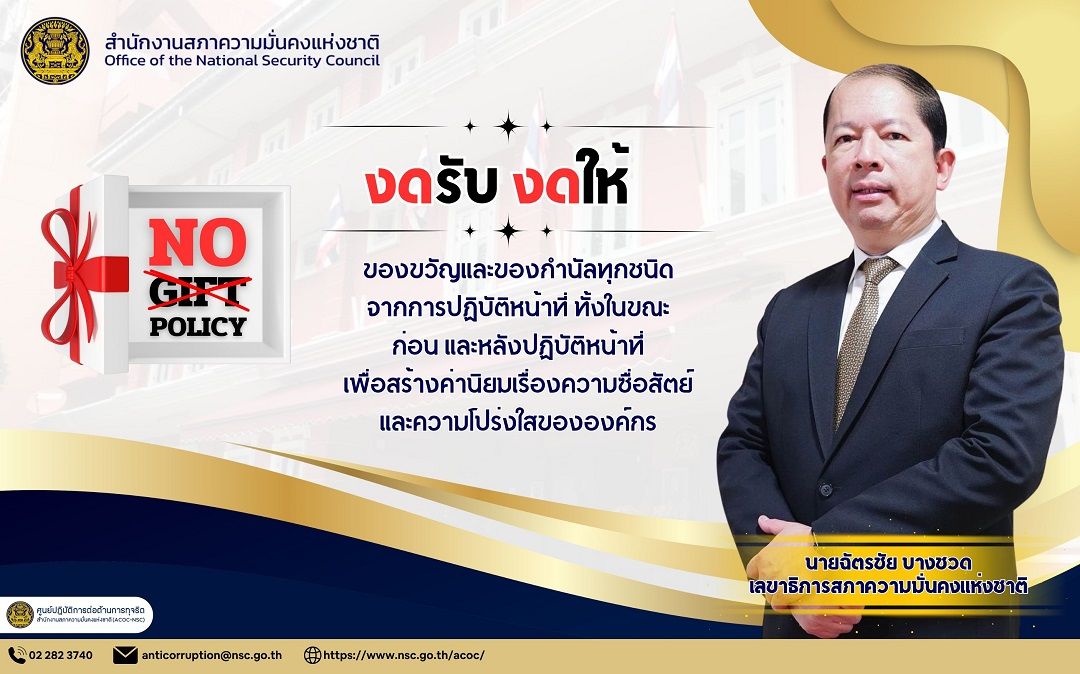 สำนักงานสภาความมั่นคงแห่งชาติ (สมช.) ตระหนักถึงความสำคัญของการเสริมสร้างให้หน่วยงานมีวัฒนธรรมและพฤติกรรมซื่อสัตย์สุจริตในการปฏิบัติงาน จึงขอให้ทุกส่วนงานภายใน สมช. ให้ความสำคัญต่อการมีจิตสำนึก ค่านิยม และทัศนคติในการดำเนินการตามนโยบายไม่รับของขวัญและของกำนัลทุกชนิดจากการปฏิบัติหน้าที่ (No Gift Policy) พร้อมทั้งได้ประกาศเจตนารมณ์การไม่รับของขวัญและของกำนัลทุกชนิดจากการปฏิบัติหน้าที่ (No Gift Policy) ประจำปีงบประมาณ พ.ศ. ๒๕๖๘ โดยขอให้ข้าราชการ เจ้าหน้าที่และบุคลากรของ สมช. ปฏิเสธการรับของขวัญและของกำนัลทุกชนิดจากการปฏิบัติหน้าที่ รวมไปถึงการปฏิบัติงานโดยไม่หวังผลประโยชน์ตอบแทนในลักษณะต่าง ๆ