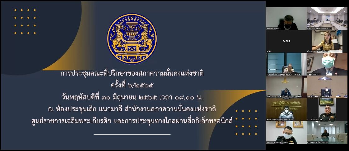 เมื่อวันพฤหัสบดีที่ ๓๐ มิถุนายน ๒๕๖๕ เวลา ๐๙.๐๐ น. สถาบันความมั่นคงศึกษา สำนักงานสภาความมั่นคงแห่งชาติ ได้จัดการประชุมคณะที่ปรึกษาของสภาความมั่นคงแห่งชาติ ครั้งที่ ๖/๒๕๖๕ โดยมีนายประกิจ ประจนปัจจนึก ประธานที่ปรึกษาฯ เป็นประธาน เพื่อรับทราบความคืบหน้าการดำเนินการจัดทำ (ร่าง) นโยบายและแผนระดับชาติว่าด้วยความมั่นคงแห่งชาติ (พ.ศ. ๒๕๖๖ – ๒๕๗๐) สถานการณ์ความมั่นคงภายในและระหว่างประเทศที่กระทบต่อความมั่นคงของไทย และสถานการณ์ด้านเศรษฐกิจและแนวโน้มที่จะส่งผลกระทบต่อไทย อีกทั้งให้ความเห็นและข้อเสนอแนะต่อ รายงานผลการศึกษาของคณะที่ปรึกษาฯ เรื่องการทบทวนปรับปรุงตัวชี้วัดระดับแนวทางบูรณาการขับเคลื่อนการแก้ไขปัญหาจังหวัดชายแดนภาคใต้ และเรื่องการขับเคลื่อนความมั่นคงทางทะเลแบบองค์รวมโดยใช้แนวคิดเศรษฐกิจสีน้ำเงิน