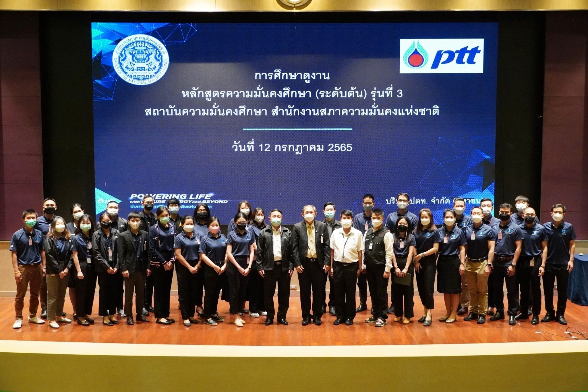 เมื่อวันที่ ๑๒ กรกฎาคม ๒๕๖๕ สถาบันความมั่นคงศึกษา (สมศ.) ศึกษาดูงานการบริหารจัดการความมั่นคงปลอดภัยและภาวะวิกฤตของบริษัท ปตท. จำกัด (มหาชน) และกลุ่ม ปตท. ภายใต้ “หลักสูตรความมั่นคงศึกษา (ระดับต้น) รุ่นที่ ๓” ณ บริษัท ปตท. จำกัด (มหาชน) จตุจักร กรุงเทพฯ (สำนักงานใหญ่) โดยมี รองเลขาธิการสภาความมั่นคงแห่งชาติ (นายรัชกรณ์ นภาพรพิพัฒน์) เป็นหัวหน้าคณะ เพื่อรับฟังการถ่ายทอดประสบการณ์บริหารจัดการความมั่นคงปลอดภัยทุกระดับ ความเสี่ยงด้านพลังงาน และมาตรการแก้ปัญหาในภาวะวิกฤตต่าง ๆ ที่เกิดขึ้นจากผู้ปฏิบัติงานของบริษัท ปตท. จำกัด (มหาชน) รวมถึงการศึกษาดูงานการบริหารความปลอดภัยของอาคารและบุคลากร อาทิ ระบบ Building Access Screening System ระบบโทรทัศน์วงจรปิดคุณภาพสูง (CCTV) เป็นต้น