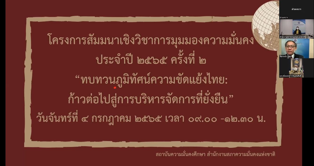 เมื่อวันจันทร์ที่ ๔ กรกฎาคม ๒๕๖๕ สถาบันความมั่นคงศึกษา สำนักงานสภาความมั่นคงแห่งชาติ ได้จัดสัมมนาเชิงวิชาการมุมมองความมั่นคง ประจำปี ๒๕๖๕ ครั้งที่ ๒ เรื่อง ทบทวนภูมิทัศน์ความขัดแย้งไทย : ก้าวต่อไปสู่การบริหารจัดการที่ยั่งยืน โดยมีนายรัชกรณ์ นภาพรพิพัฒน์ รองเลขาธิการสภาความมั่นคงแห่งชาติ เป็นประธาน เพื่อแลกเปลี่ยนความคิดเห็นและประสบการณ์ระหว่างนักวิชาการ ผู้เชี่ยวชาญจากสถาบันการศึกษา และหน่วยงานราชการ เกี่ยวกับพลวัตความขัดแย้งในสังคมไทยและการเคลื่อนไหวของคนรุ่นใหม่ในปัจจุบัน รวมถึงแนวคิดสันติวิธีในการบริหารจัดการความขัดแย้งอย่างยั่งยืน เพื่อประมวลข้อมูลและข้อเสนอแนะทางวิชาการประกอบการดำเนินงานด้านความมั่นคง