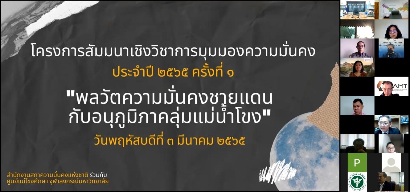 เมื่อวันพฤหัสบดีที่ ๓ มีนาคม ๒๕๖๕ สถาบันความมั่นคงศึกษา สำนักงานสภาความมั่นคงแห่งชาติ ได้จัดการโครงการสัมมนาเชิงวิชาการมุมมองความมั่นคง ประจำปี ๒๕๖๕ ครั้งที่ ๑ เรื่อง พลวัตความมั่นคงชายแดนกับอนุภูมิภาคลุ่มแม่น้ำโขง โดยมีนายรัชกรณ์ นภาพรพิพัฒน์ รองเลขาธิการสภาความมั่นคงแห่งชาติ เป็นประธาน ณ ห้องประชุมเล็ก แนวมาลี สำนักงานสภาความมั่นคงแห่งชาติ ศูนย์ราชการเฉลิมพระเกียรติฯ และการประชุมทางไกลผ่านสื่ออิเล็กทรอนิกส์ (ระบบ Zoom)