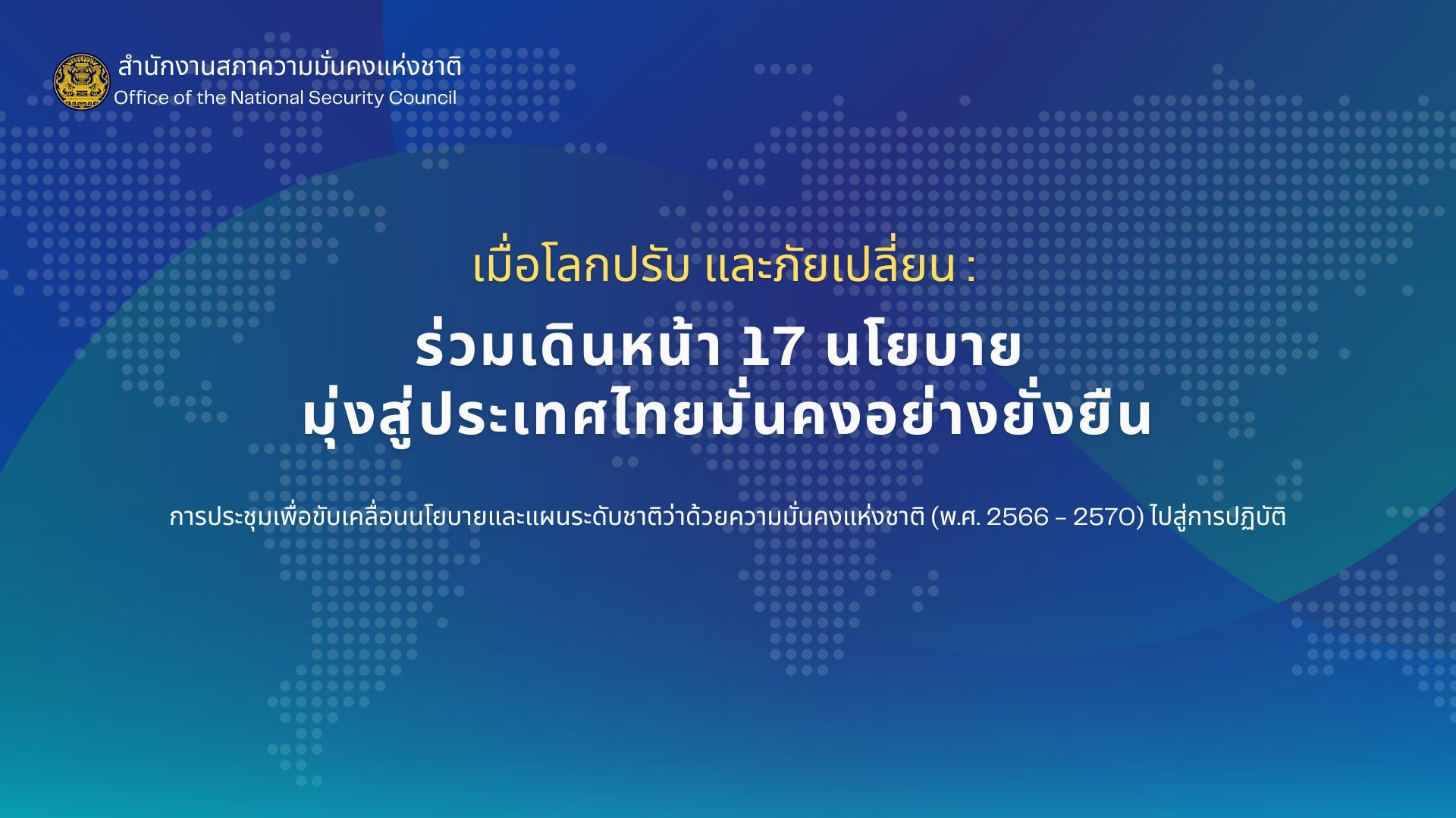 เลขาธิการ สมช. ได้กล่าวถึง การเปลี่ยนแปลงบริบทความมั่นคง ทั้งในระดับโลก ภูมิภาค และประเทศไทย จึงให้จัดทำนโยบายและแผนระดับชาติฯ เพื่อเป็นกรอบทิศทางดำเนินการป้องกัน แจ้งเตือน แก้ไข หรือระงับยับยั้งภัยคุกคาม เพื่อธำรงไว้ซึ่งความมั่นคงแห่งชาติ ซึ่งดำเนินการตามพระราชบัญญัติสภาความมั่นคงแห่งชาติ พ.ศ. 2559 มุ่งเน้นกำหนดทิศทางพุ่งเป้าหมายการป้องกันและแก้ไขปัญหาความมั่นคงที่มีผลกระทบรุนแรงและความเสี่ยงสูง โดยเฉพาะปัญหาความมั่นคงเร่งด่วนที่จะต้องดำเนินการแก้ไขโดยเร็วและทันท่วงที โดยวางรากฐานความมั่นคงของประเทศอยู่ที่สถาบันครอบครัวและสถาบันการศึกษา ตลอดจนการเข้ามามีส่วนร่วมของทุกภาคส่วนในการขับเคลื่อนงานความมั่นคง