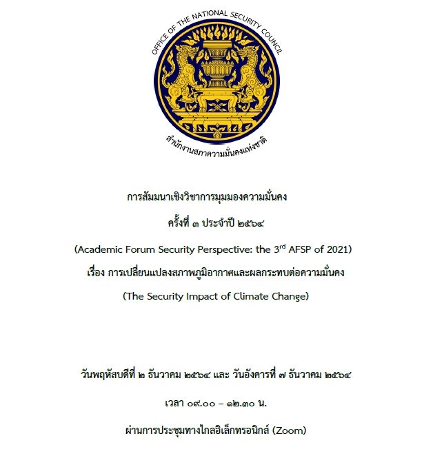 เมื่อวันที่ ๒ ธันวาคม และ วันที่ ๗ ธันวาคม ๒๕๖๔ สถาบันความมั่นคงศึกษา สำนักงานสภาความมั่นคงแห่งชาติ ได้จัดการสัมมนาเชิงวิชาการ เรื่อง การเปลี่ยนแปลงสภาพภูมิอากาศและผลกระทบต่อความมั่นคง (The Security Impact of Climate Change) โดยมีนายรัชกรณ์ นภาพรพิพัฒน์ รองเลขาธิการสภา