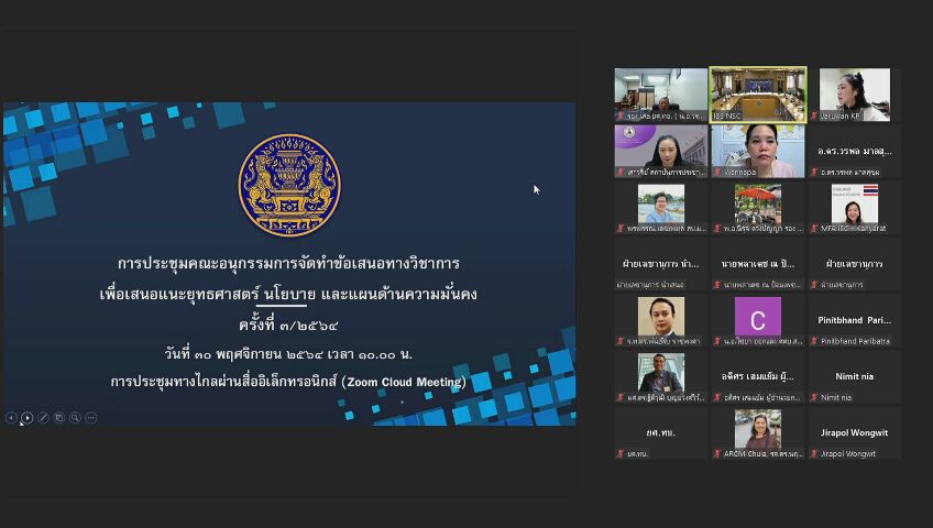 เมื่อวันอังคารที่ ๑๔ ธันวาคม ๒๕๖๔ เวลา ๑๔.๓๐ น. พลเอก สุพจน์ มาลานิยม เลขาธิการสภาความมั่นคงแห่งชาติ เป็นประธานการประชุมคณะกรรมการขับเคลื่อนแผนย่อยด้านการพัฒนากลไกการบริหารจัดการความมั่นคงแบบองค์รวม ครั้งที่ ๒/๒๕๖๔ ณ ห้องประชุมวิจิตรวาทการ สำนักงานสภาความมั่นคงแห่งชาติ ทำเนียบรัฐบาล โดยมีหน่วยงานด้านความมั่นคง ซึ่งเป็นเจ้าภาพแผนย่อยของแผนแม่บทภายใต้ยุทธศาสตร์ชาติ ประเด็นความมั่นคง หน่วยงานเจ้าภาพขับเคลื่อนระดับเป้าหมายของแผนย่อยฯ และหน่วยงานเจ้าภาพแนวทางการพัฒนาของแผนย่อยฯ อาทิ กองอำนวยการรักษาความมั่นคงภายในราชอาณาจักร ศูนย์อำนวยการรักษาผลประโยชน์ของชาติทางทะเล กระทรวงกลาโหม กระทรวงการต่างประเทศ เข้าร่วมประชุม เพื่อพิจารณาแนวทางการขับเคลื่อนและติดตามผลการดำเนินงานตามยุทธศาสตร์ชาติด้านความมั่นคง ประจำปีงบประมาณ ๒๕๖๕ ซึ่งเป็นปีที่สำคัญ เนื่องจากใกล้สิ้นสุดห้วงระยะที่ ๑ (พ.ศ. ๒๕๖๑ – ๒๕๖๕) ของยุทธศาสตร์ชาติและแผนแม่บทภายใต้ยุทธศาสตร์ชาติ โดยแนวทางการขับเคลื่อนฯ จะมุ่งเน้นการกำกับ ติดตาม และรายงานผล การกำหนดขั้นตอนการปฏิบัติที่ชัดเจน และเป็นไปตามปฏิทินดำเนินงาน เพื่อให้หน่วยงานนำไปขับเคลื่อนฯ ให้เกิดผลสัมฤทธิ์เป็นรูปธรรมต่อไป